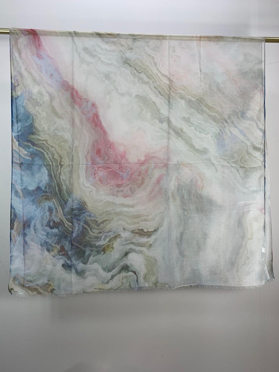 Elevate your accessory collection with this stunning, abstract-print scarf. Featuring a delicate interplay of ethereal pinks, calming blues, and earthy neutral tones, its fluid, marble-inspired design evokes the natural beauty of a desert sunset or a weathered geode. The translucent, lightweight fabric offers a graceful drape, making it the perfect year-round piece—whether loosely knotted for a casual daytime look or elegantly draped over your shoulders for an evening out.